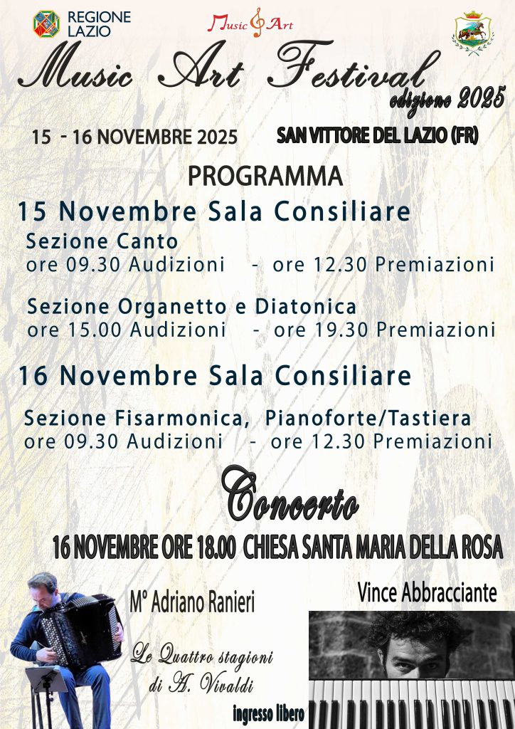 L’Associazione musicale-culturale “Music Art” con il patrocinio del Comune S. Vittore del Lazio, nell’ambito del Music Art Festival – edizione 2025, cofinanziato dalla Regione Lazio – Contributi spettacolo dal vivo (annualità 2025), organizza il “Premio Internazionale Music Art Festival – edizione 2025” di S. Vittore del Lazio (FR) riservato a tutti i musicisti di qualsiasi nazionalità.